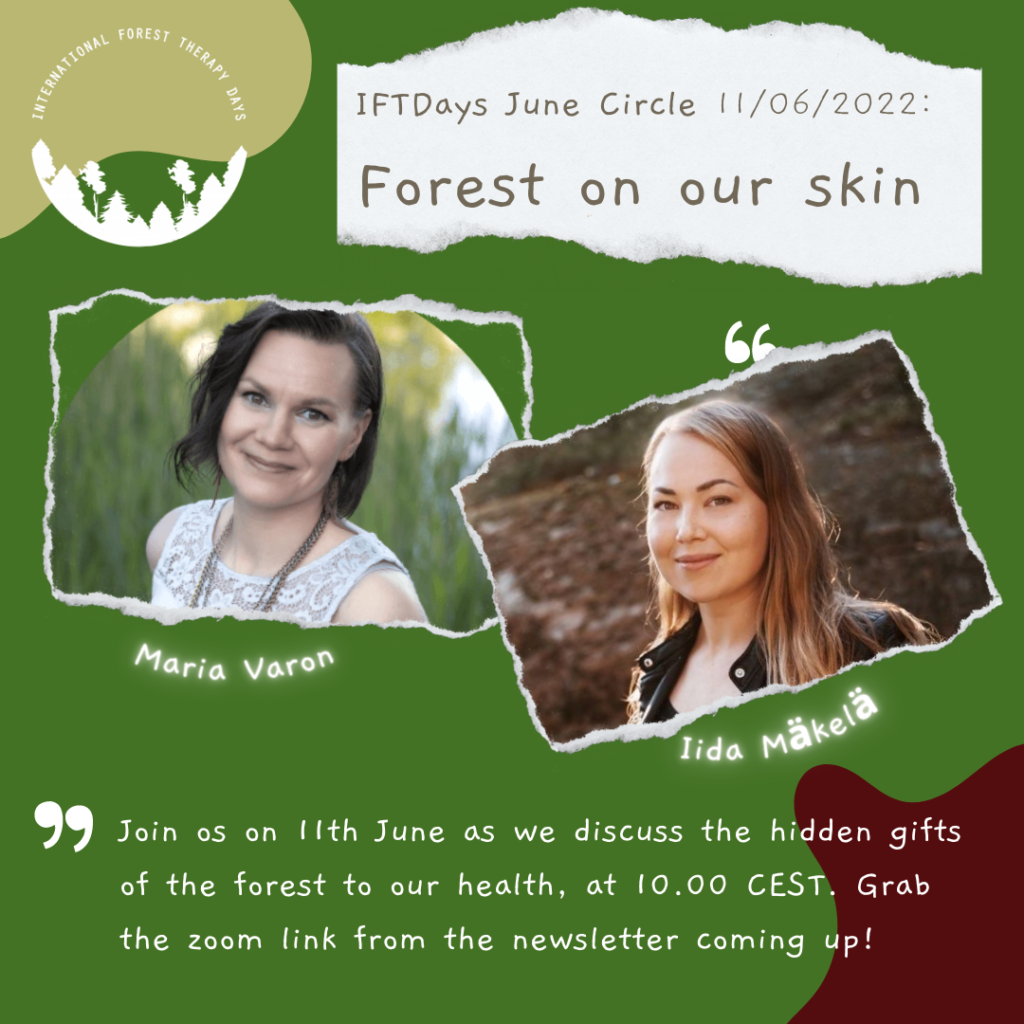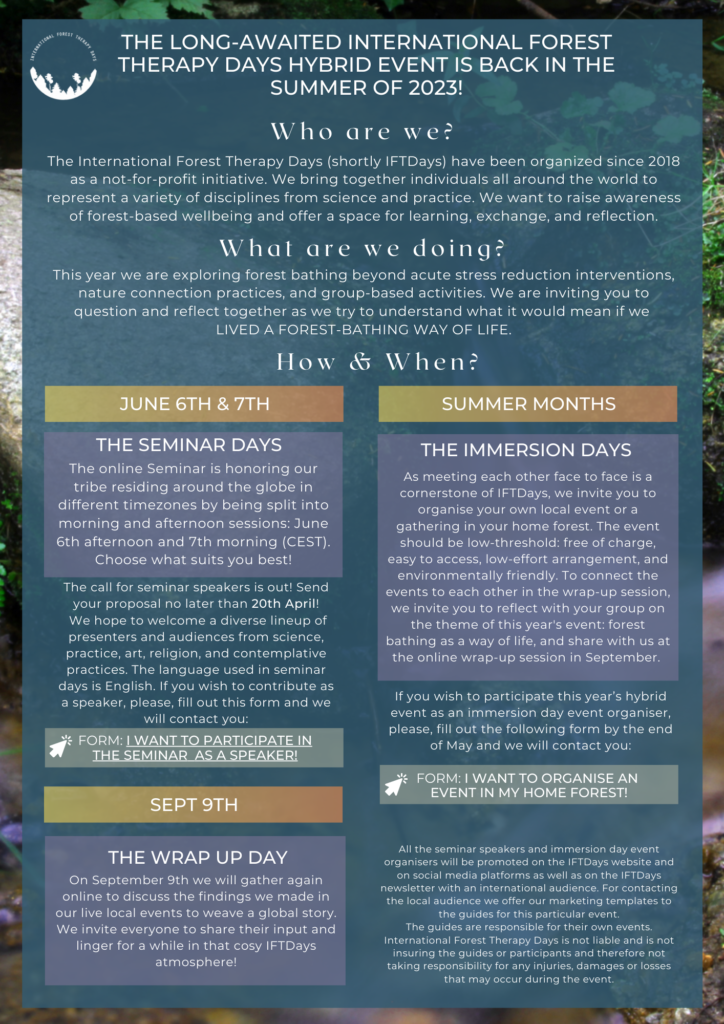 IFTDays started in 2018 with our first live event that took place in Finland. After that our events have taken different forms, from live meetings to online circles. After the pandemic and many developments in the field of forest theraoy, we have settled on monthly online circles that bring together everyone who has ever experienced the magic of the forest and who has questions and concerns and wants to engage in a likeminded network of people.
